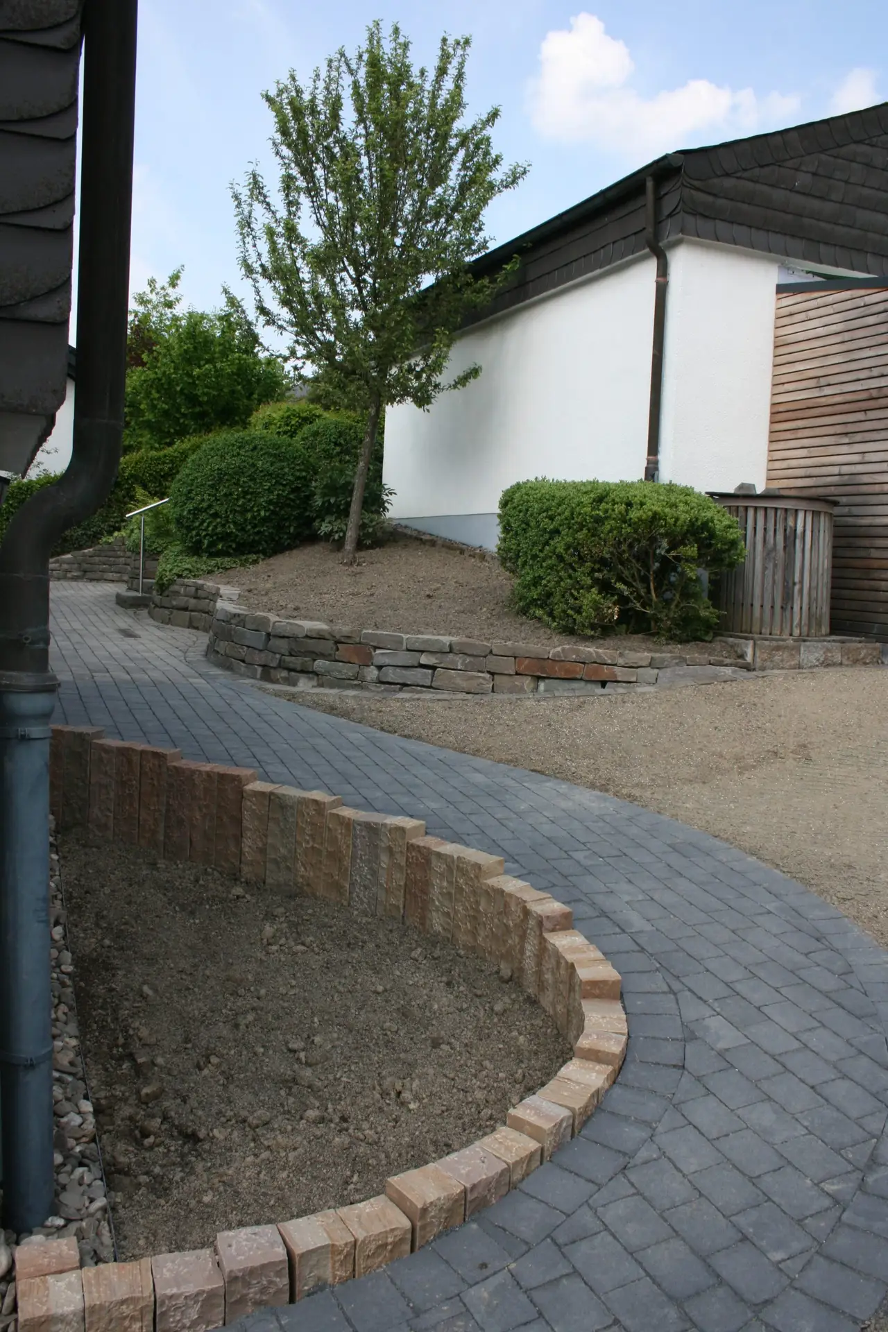 Neben stilvollen Bepflanzungen realisieren wir auch anspruchsvollen Landschaftsbau – von präzise gefertigten Mauern über funktionale Treppen bis hin zu langlebigen Pflasterflächen.
